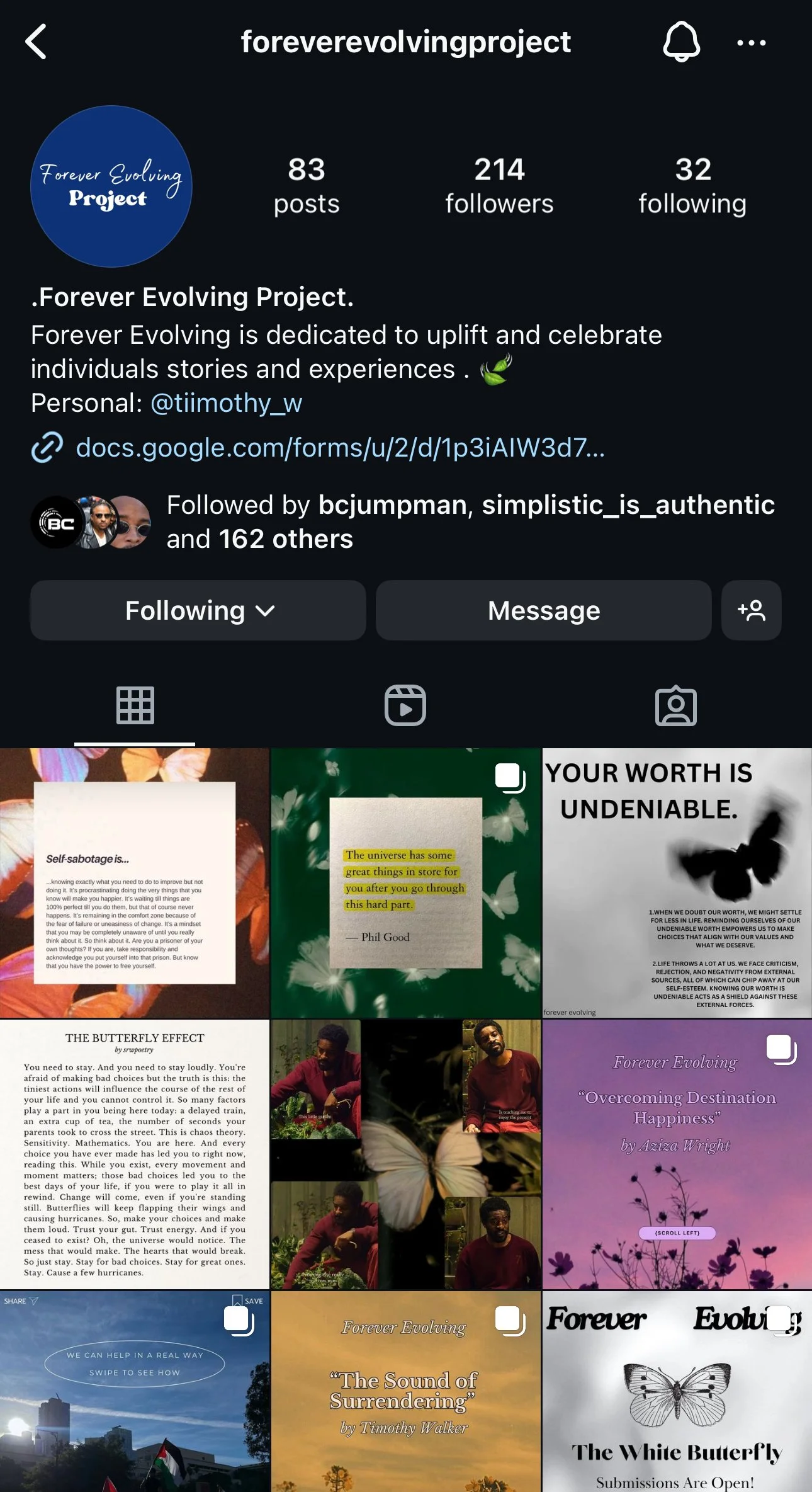 Forever Evolving Project started as an Instagram page created by Timothy Walker dedicated to the celebration and showcasing of individual stories. Reflections submitted by people are designed to give them a platform where they can unapologetically share mistakes, triumphs, and everything in between with the ultimate goal of building a community where everyone feels supported and loved. To date, we have received and shared 20+ stories that cover a range of topics from people of all ages, backgrounds, and demographics.