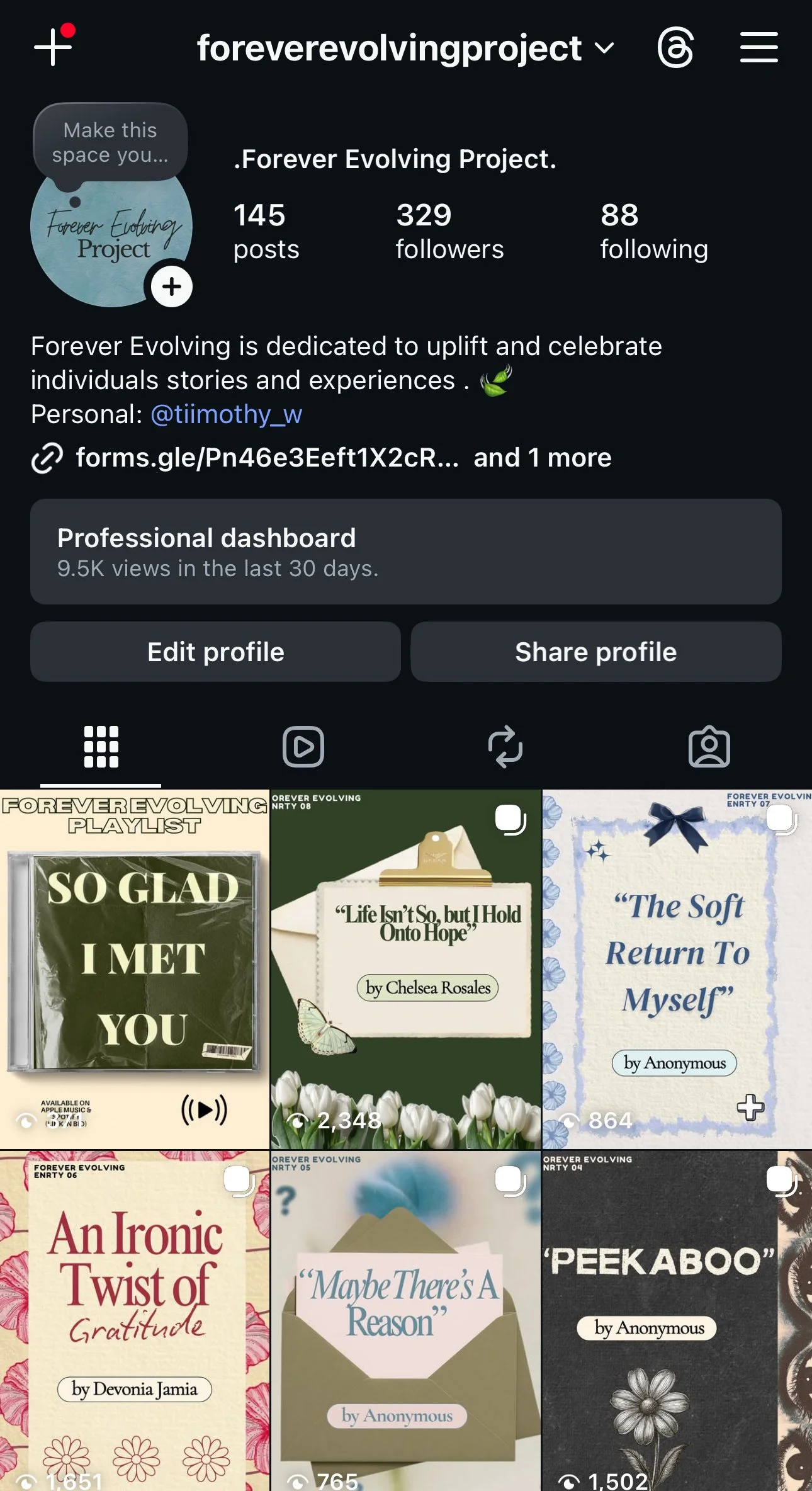 Forever Evolving Project began as an Instagram page dedicated to honoring individual stories. The platform invites people to unapologetically share their experiences — from mistakes to milestones — and has since featured 40+ reflections from diverse voices, fostering a community grounded in care and connection.