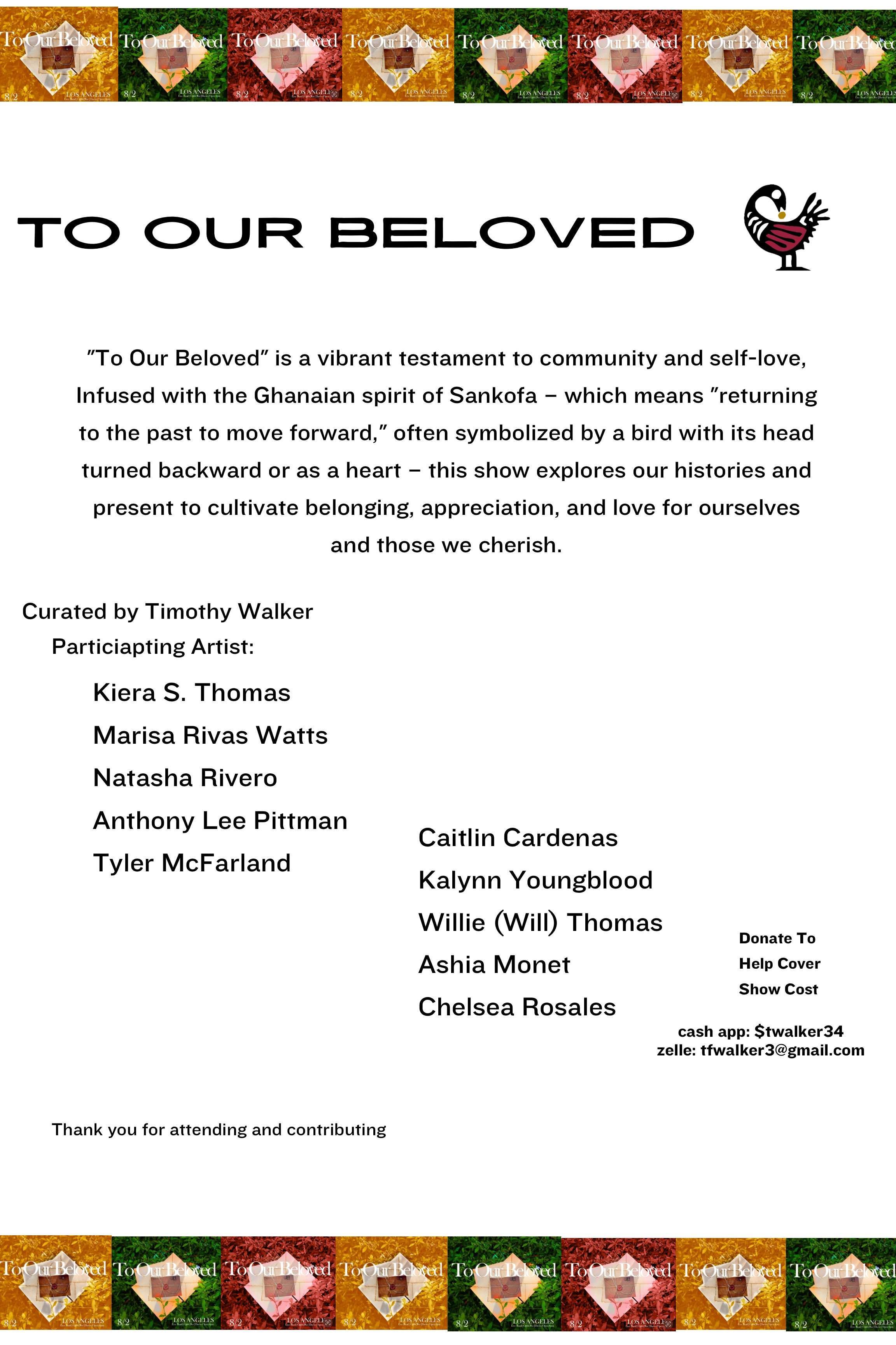 "To Our Beloved" is a vibrant testament to community and self-love, Infused with the Ghanaian spirit of Sankofa – which means "returning to the past to move forward," often symbolized by a bird with its head turned backward or as a heart – this show explores our histories and present to cultivate belonging, appreciation, and love for ourselves and those we cherish.